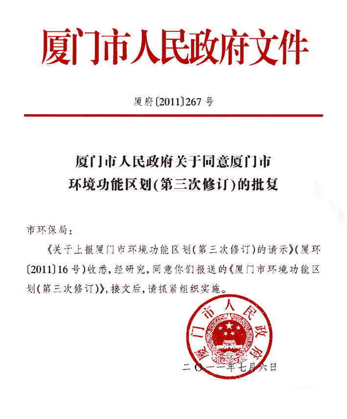 ● 《厦门市环境功能区划》由厦门市人民政府批准实施。